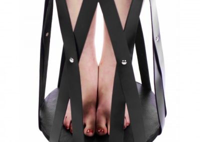 This incredible bondage device is made of sturdy leather straps, designed to enfold, enclose, and ensnare your subject. The solid platform base allows your partner to stand inside. As they step on the leather wrapped wooden platform, the weight pulls the crisscrossed leather straps downward, trapping your subject inside. The mechanism is similar to how a Chinese finger trap works. Once inside, your partner is caught and at your mercy. The leather straps will twist around your lover, cradling their body as they spiral upwards, coming together at the top where the straps attach to a sturdy leather-wrapped metal ring.
